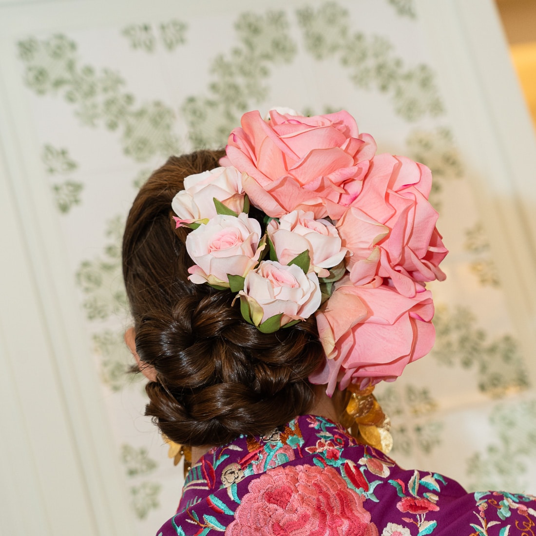 Flor flamenca compuesta por un ramillete lateral de rosas de tacto natural y cuatro mini rosas para recogido. Perfecto para combinarlo con tu traje de gitana.
