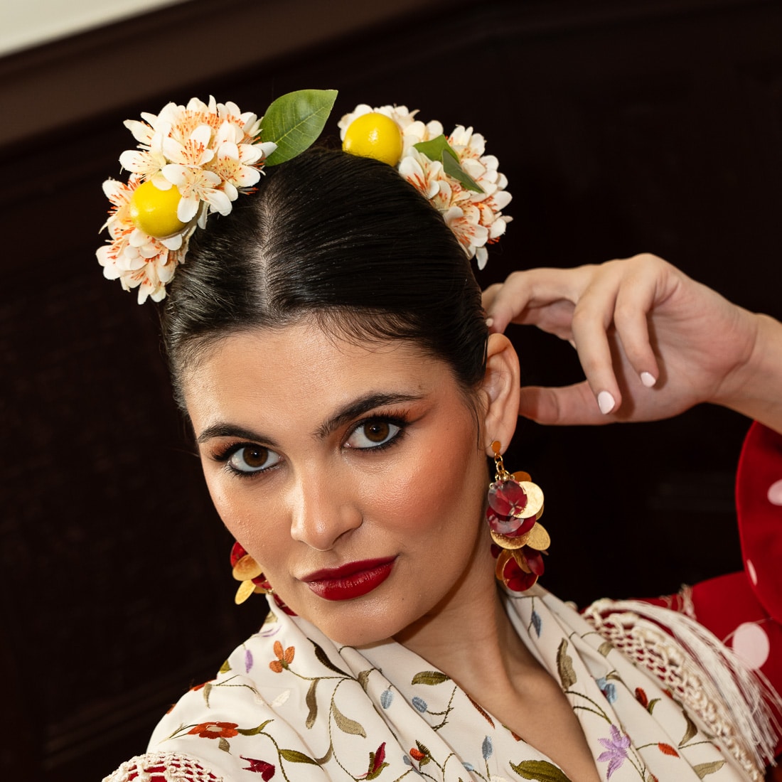 Doble ramillete de flores flamencas con diseño andaluz compuesta por siete ramitos de azahar, dos hojas y dos limones para el pelo. Ideal para combinarlo con tu traje de gitana.
