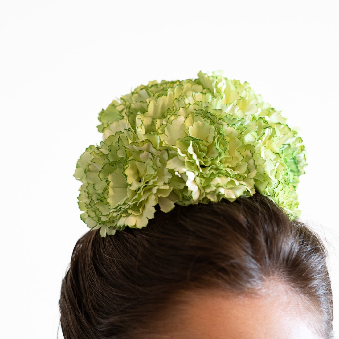 Flor flamenca compuesta por un ramillete de cinco claveles para el pelo en tono verde lima. Ideal para combinarlo con tu traje de gitana.